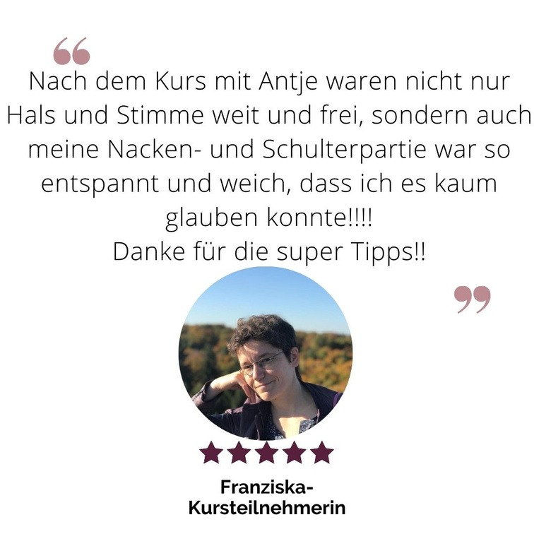 Ich bin Antje Langnickel, ausgebildete Stimmtrainerin und lange Zeit selbst anspannungsbedingten Stimmproblemen hilflos ausgeliefert gewesen.